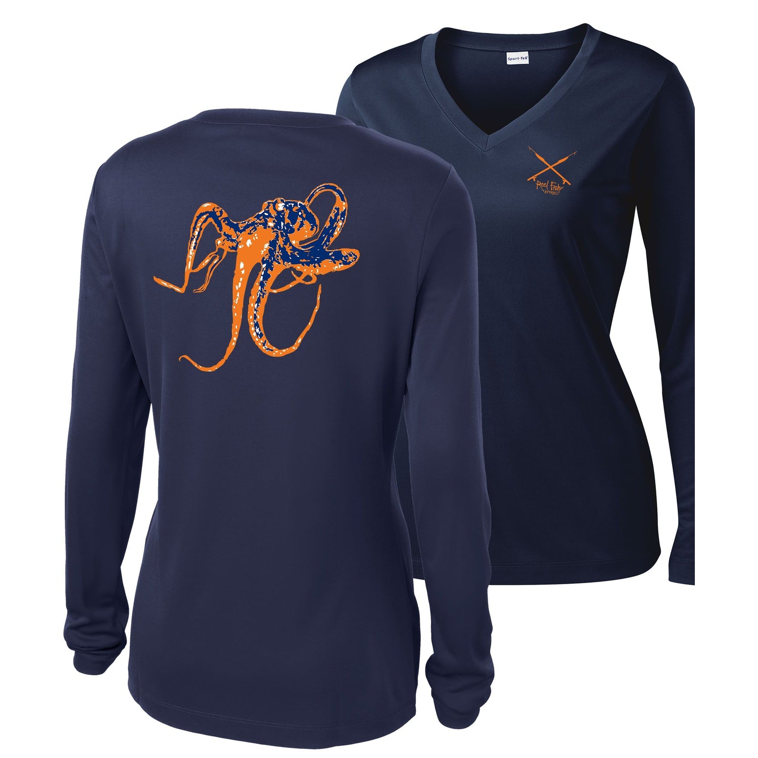 Designed specifically for women outdoor enthusiasts and anglers, our Ladies Octopus Performance V-neck Dry-fit Shirt offers the ultimate blend of style, comfort, and sun protection. Crafted from lightweight 100% polyester interlock jersey, this breathable, quick-drying shirt is ideal for everything from fishing and snorkeling to hiking and boating. Perfect for long hours under the sun, it provides excellent solar blockage, making it your go-to choice for any adventure, on or off the water.