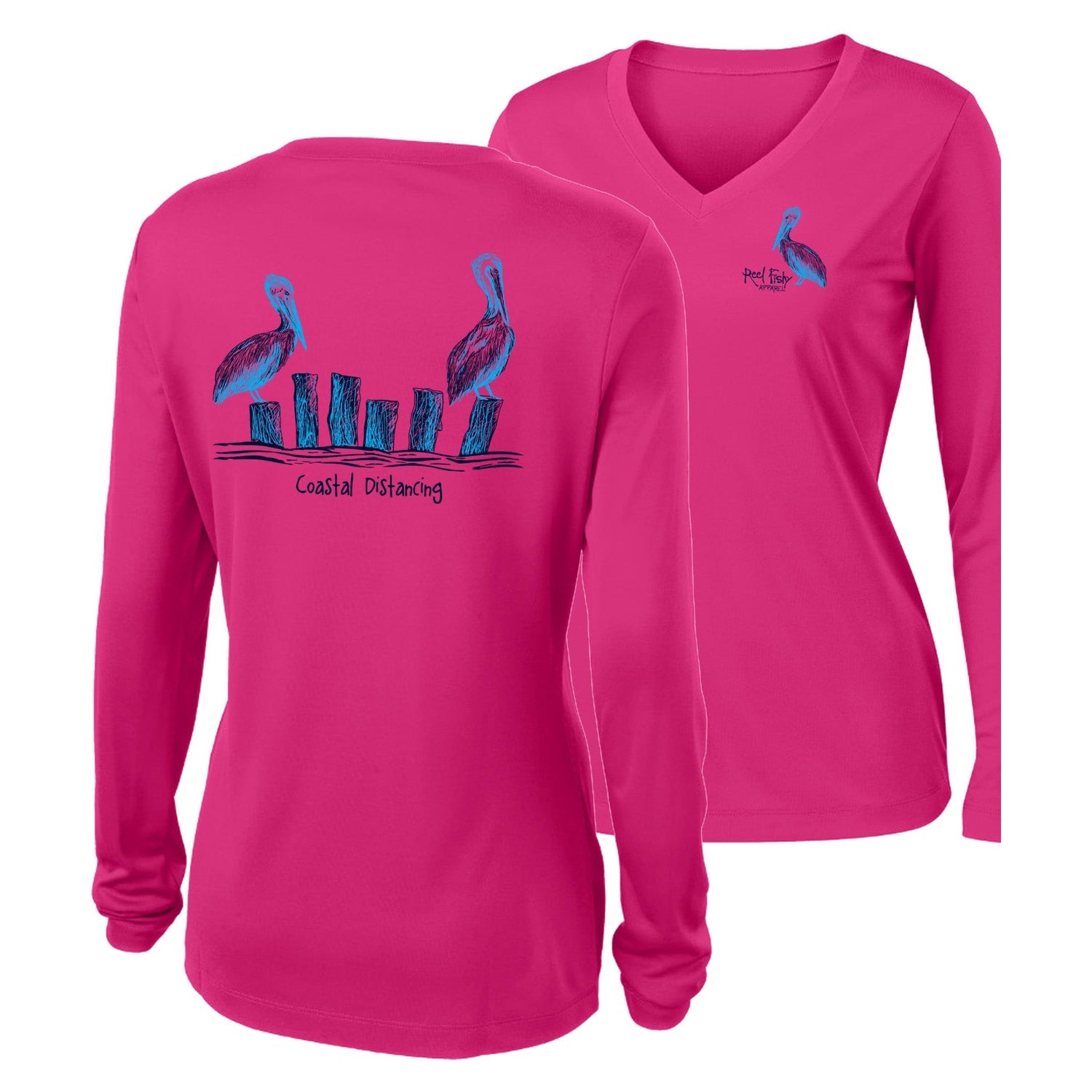 Experience unbeatable comfort and superior sun protection with Ladies Coastal Distancing Pelicans V-neck performance dry-fit shirts, featuring a 50+ UPF rating to shield you from harmful rays. Available in both long and short sleeves, these shirts are perfect for fishing, boating, snorkeling, beach days, and all your outdoor adventures. Crafted to be lightweight, breathable, and designed to keep you cool and dry, they move with you and protect your skin no matter where your day takes you. With a playful wink of coastal charm, these shirts channel pelicans keeping their cool and their distance with style. Whether you’re on or off the water, they deliver top performance, comfort, and sun defense.