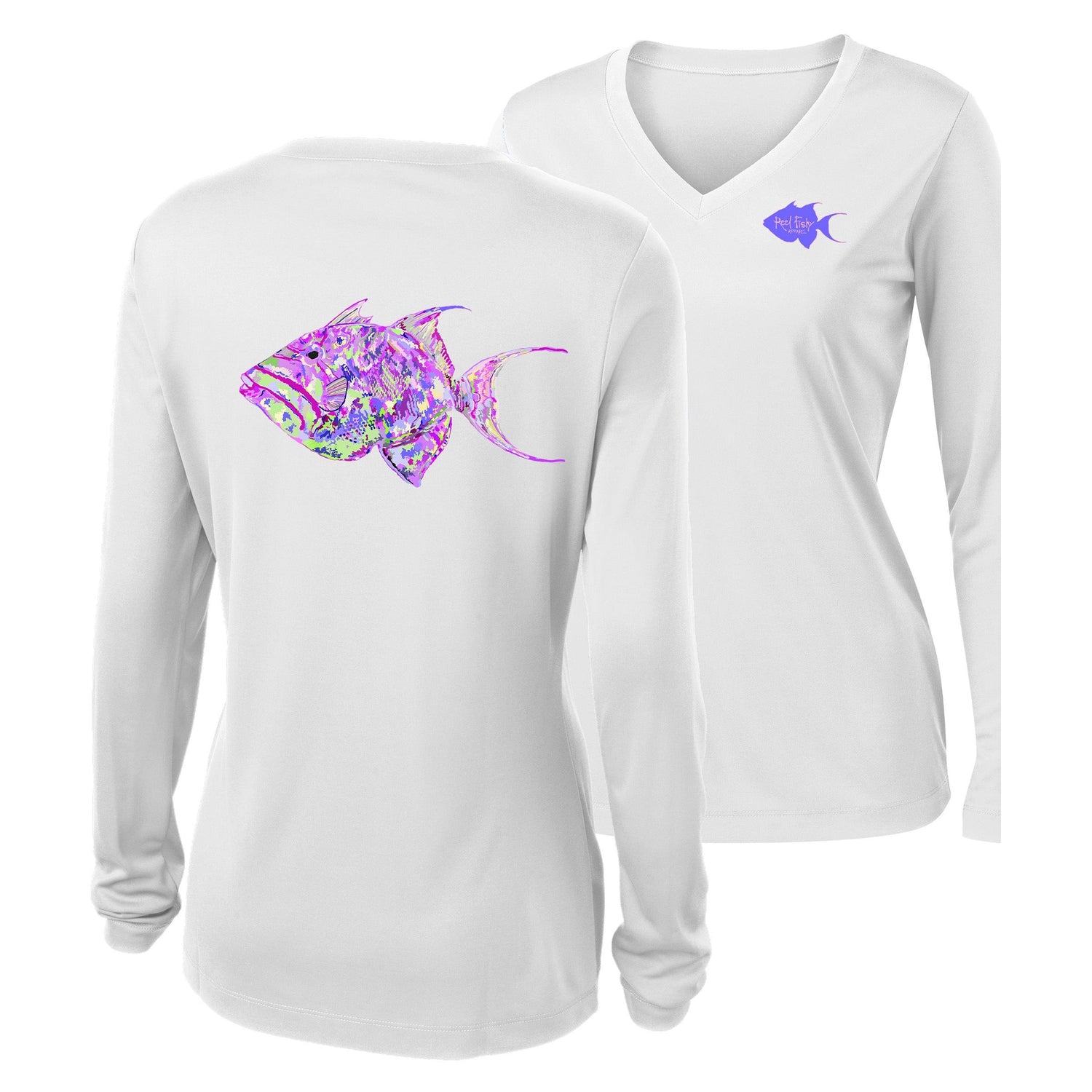 Stay cool, dry, and protected with the Ladies Triggerfish Performance V-neck Dry-Fit Shirts. Featuring a vibrant, colorful Triggerfish design and a 50+ UPF rating, these shirts provide excellent solar blockage while keeping you comfortable during all your favorite outdoor activities. Whether you're fishing, boating, snorkeling, sailing, or enjoying a day at the beach, this shirt has you covered. Lightweight, breathable, and designed for all-day wear—ideal for life on or off the water.